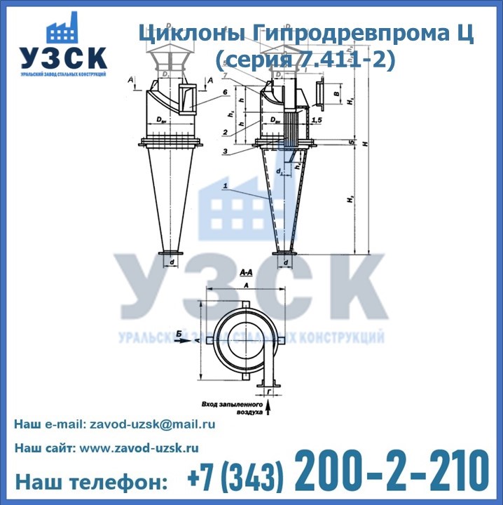 Циклоны Гипродревпрома Ц (серия 7.411-2) высокого качества можно купить в компании «УЗСК» в Ярославле. Наши специалисты предоставят всю необходимую информацию информацию и помогут с выбором модели циклона. Подробные технические характеристики, конструкцию, параметры, ассортимент и стоимость продукции можно также найти на сайте УЗСК.